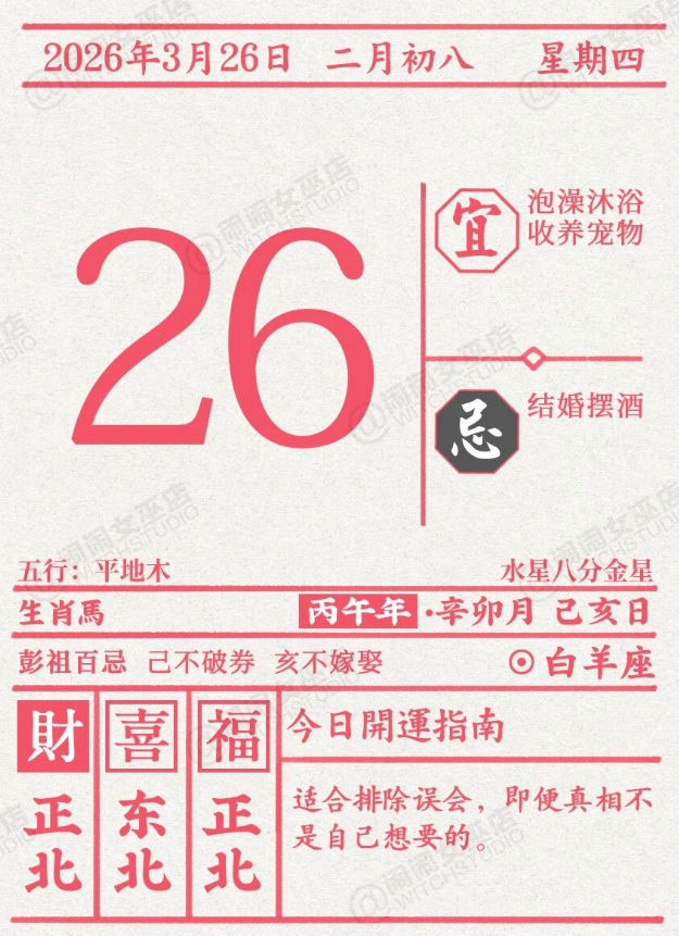今天你所在的团队的名誉会受到考验。你可能需要为团队处理一些危机公关事件,或者代表团队发表声明。需要注意的是,今天你要比平时更加谨言慎行,不要在敏感时期引起别人的误会。
